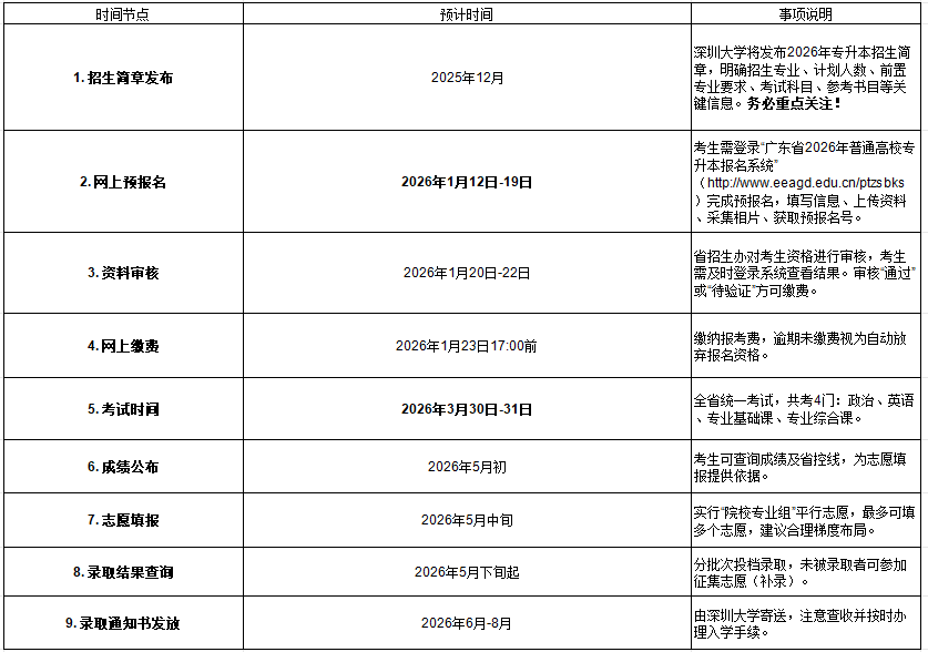 随着2025年接近尾声,备战2026年广东普通专升本(俗称“专插本”)的考生们已进入关键备考阶段。作为广东省内热门报考院校之一,深圳大学(深大)凭借其优越的地理位置、强劲的学科实力和良好的就业前景,成为众多专科生“升本上岸”的理想目标。那么2026年深大专升本报名时间是什么时候?下面一起来看看。