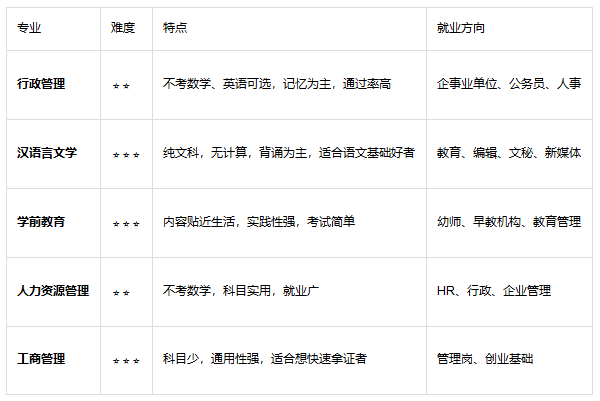 3. 考试难度优先:优先选择“不考数学、英语可选、科目少”的专业。