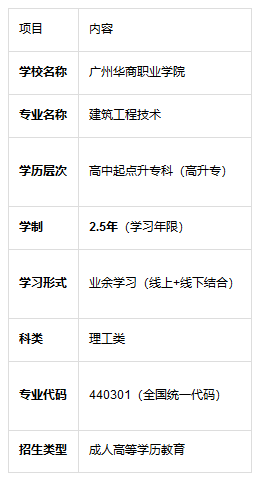 以上就是广州华商职业学院成人高考(高升专)建筑工程技术专业的相关内容,如有其他学历疑问,欢迎免费咨询深大优课在线专业老师!
