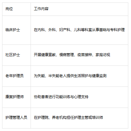 毕业生可从事临床护理、社区护理、老年护理、康复护理等工作,是实现“健康中国”战略的重要人才支撑。