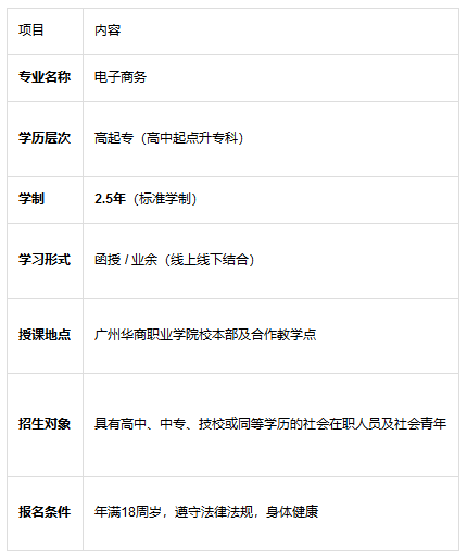 以上就是广州华商职业学院成人高考(高升专)电子商务专业的相关内容,如有其他学历疑问,欢迎免费咨询深大优课在线专业老师!