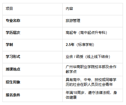 以上就是广州华商职业学院成人高考(高升专)旅游管理专业的相关内容,如有其他学历疑问,欢迎免费咨询深大优课在线专业老师!