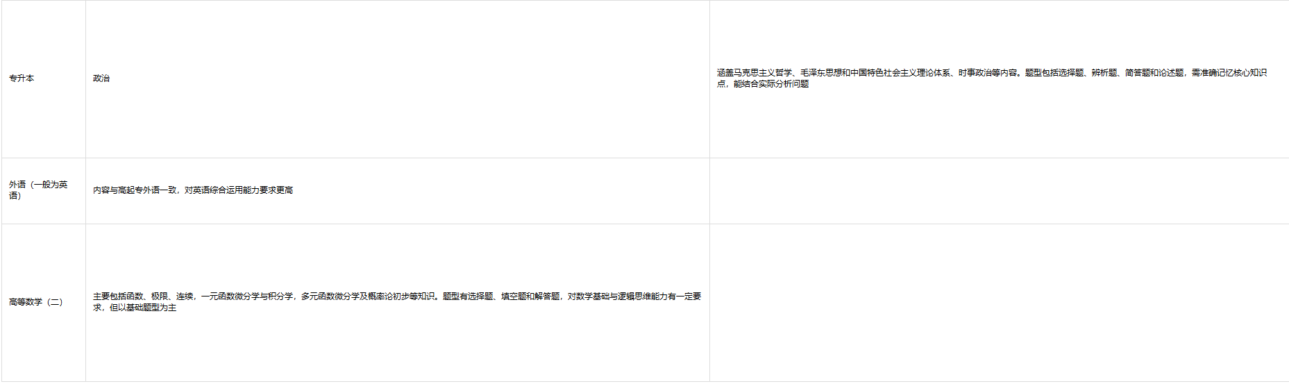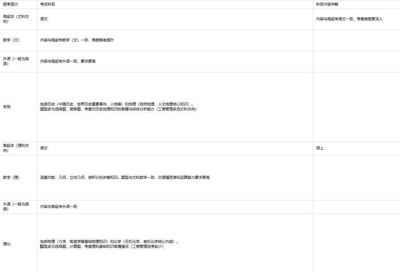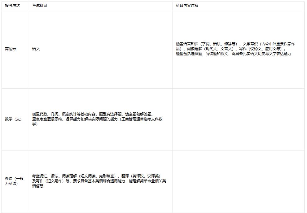 深圳工商管理成人高考按报考层次划分,考试科目与内容有所不同,具体如下表所示:
