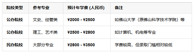 佛山大学(本地名校):往年标准约为 2500元/年,2.5年总费用约6250元。