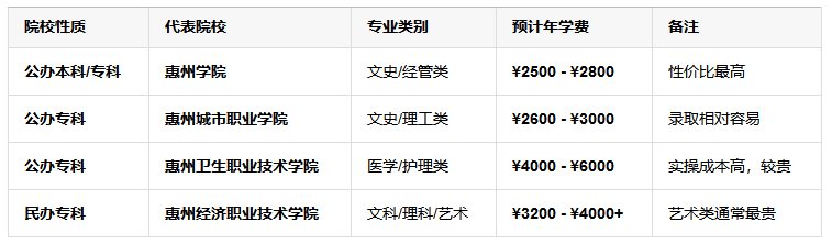 公办优先,性价比高:如果你追求性价比,建议首选惠州学院或惠州城市职业学院的公办专业,总花费通常在 6000元 - 8000元 左右(2.5年总学费)。