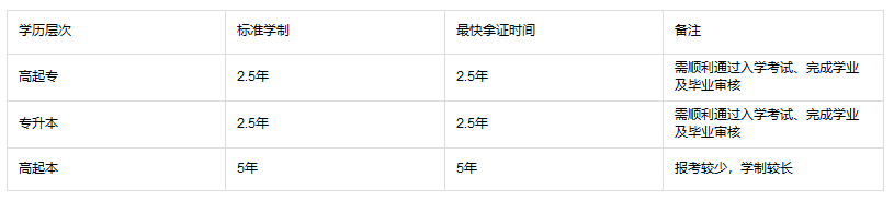 1. 高起专层次:学制2.5年,最快2.5年拿证。例如,2024年9月报名,2025年3月入学,2027年9月左右可毕业拿证。