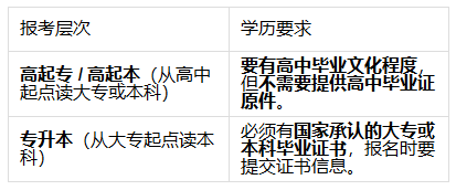 也就是说,即使你没有高中毕业证,但只要你实际具备高中文化水平,就可以报考高起专或高起本。很多中专、职高、技校毕业生,甚至初中毕业多年、自学成才的人,都可以报。
