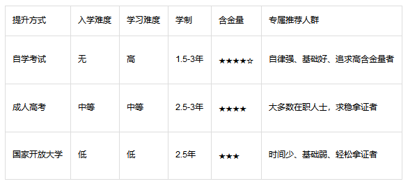 首选自考(含金量高,时间灵活,推荐自考助学班提升通过率);