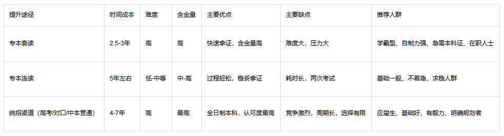 想最快拿本科证、能吃苦、自律强,优先选“专本套读”(成考/国开专科+自考本科)。