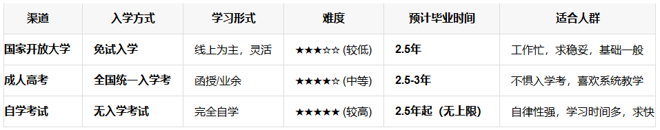 说明:国家开放大学每年3月、9月两次入学机会,免试入学,学习以线上课程为主,期末考试简单,适合基础薄弱、时间紧张的在职人员。