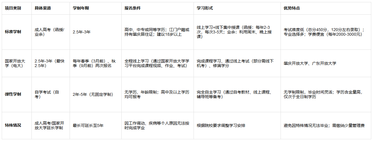肇庆在职读大专的正规渠道均为国家认可的成人高等教育类型,分别是成人高考、自学考试、国家开放大学,部分时段还有高职扩招政策可争取全日制学历,不同渠道的学制适配不同时间安排的在职人群,那么肇庆在职读大专需要几年?具体详情如下: