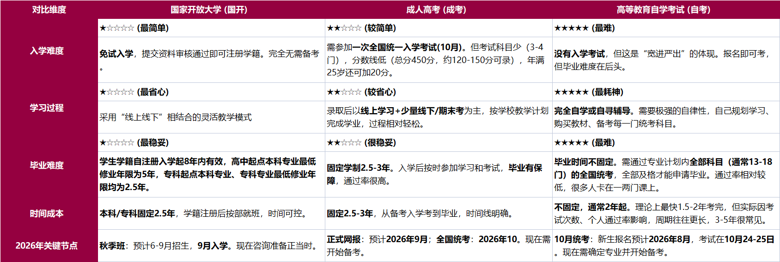 国开vs成考vs自考,2026年广东在职提升学历选哪个最简单?