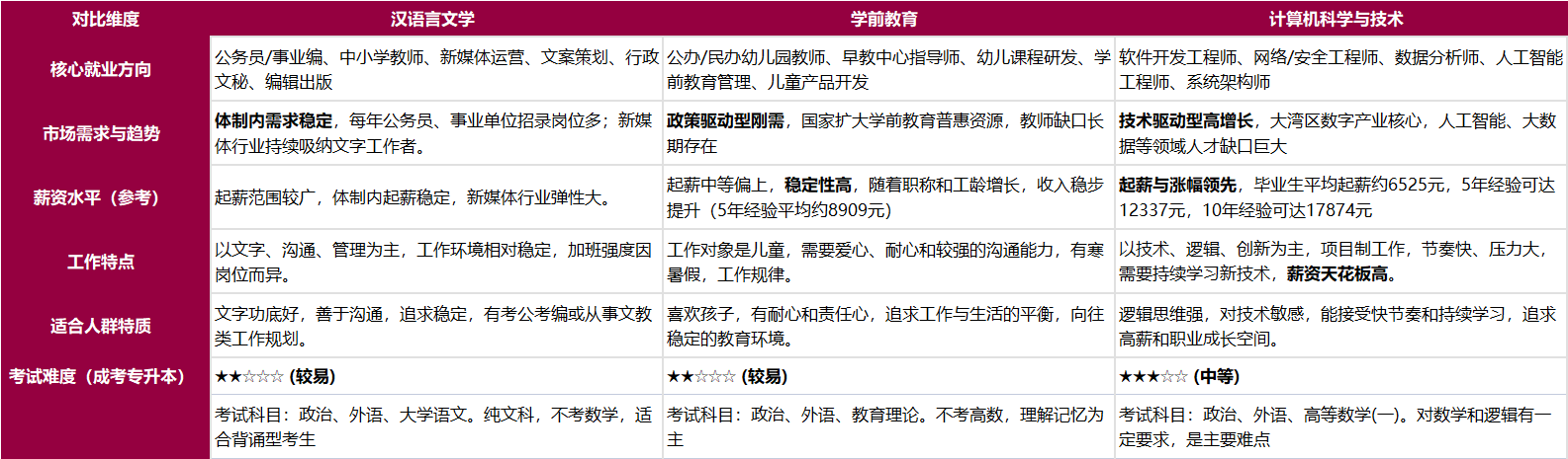 没有“最好”,只有“最适合”! 汉语言文学是通往体制内的“黄金跳板”,学前教育是拥抱政策红利的“稳定港湾”,计算机科学与技术则是驰骋数字经济的“高薪快车”。选择哪个,完全取决于你的职业目标和个人特质。今天,深大优课为你深度剖析2026年广东成人本科五大热门专业,并重点拆解这三者的就业前景,帮你找到最适合自己的“本命专业”。