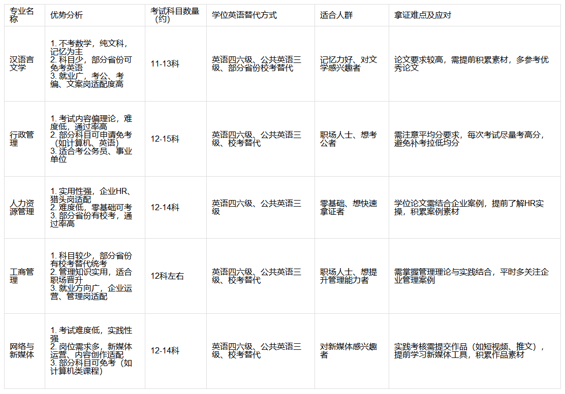 选对专业是2.5年毕业的核心,优先选择“科目少、难度低、免考机会多、学位易拿”的专业,以下为热门速通专业对比,可根据自身基础和目标选择。