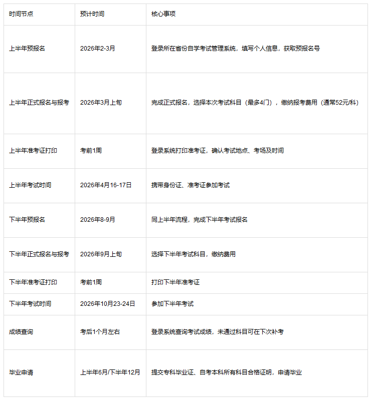 2026年自考本科分为上半年(4月考试)和下半年(10月考试)两次考期,关键时间节点如下: