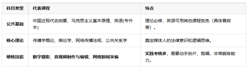 避坑指南: 虽然不考数学,但会有英语(专升本)的要求(部分情况下可选考其他科目抵免,需关注具体政策)。此外,该专业有很多实操作业(如拍视频、做推文),需要你投入时间和精力去“产出”,不能只死记硬背。