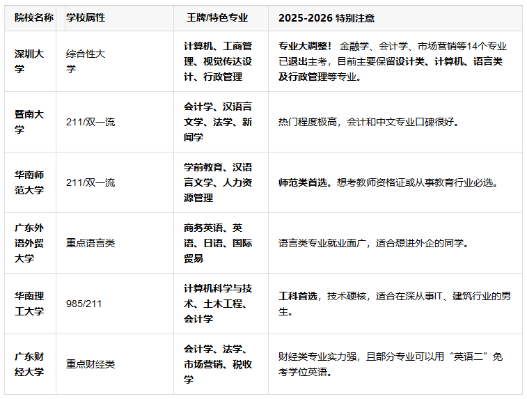 深圳成人自考学校有哪些?根据2025年最新的政策调整(特别是深圳大学等高校的专业调整),为大家整理了目前深圳自考最全的主考院校名单,具体如下: