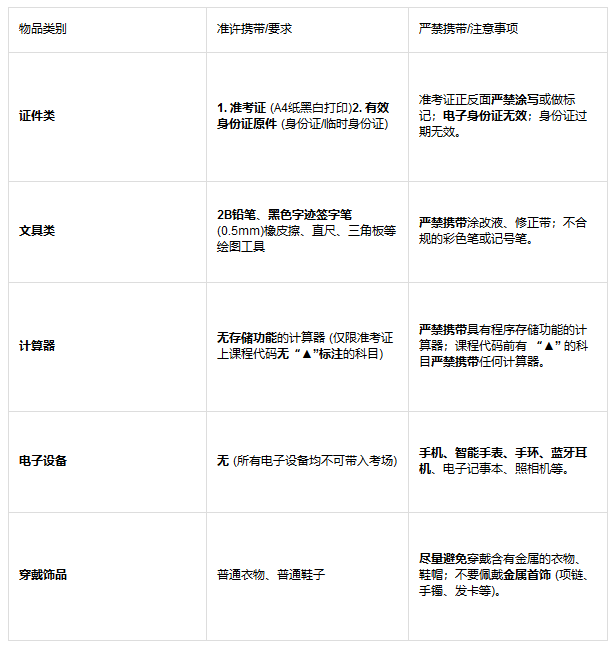 请考生务必对照此表, “轻装上阵” ,避免因携带违禁物品导致无法入场。