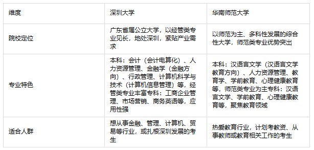对比总结:深圳大学专业更偏向应用型,与深圳产业发展紧密相关,适合想在金融、管理、计算机等领域发展的考生;