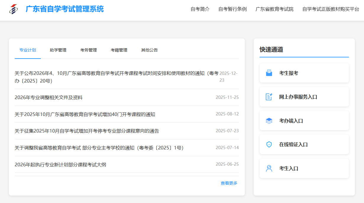 操作流程:登录广东省自学考试管理系统(https://www.eeagd.edu.cn/selfec/)→点击【考生入口】-【考生预报名】→填写个人信息(姓名、身份证号、联系方式等)→提交后获取预报名号→上传身份证照片,完成相片采集→获取准考证号,即完成预报名。 正式报名时间:2026年2月26日-3月1日(与预报名同步进行,需在预报名后完成)。