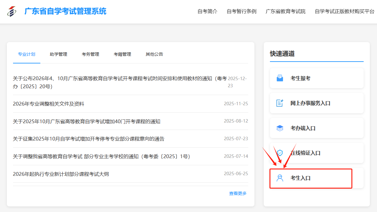 使用准考证号和预设密码,登录广东省自学考试管理系统,进入【考生报考】通道。