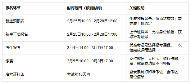 湛江自考报名涉及多个环节,每个环节均有明确起止时间,新生需严格按时间操作,避免因错过节点导致报名失败。以下是2026年4月报名预测时间,具体请以官方通知时间为准: