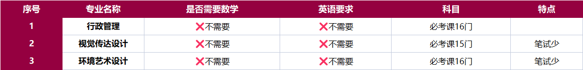 1.专业选择是第一关:优先选择 行政管理、视觉传达设计等不考数学、英语的专业,避开自己的知识短板。